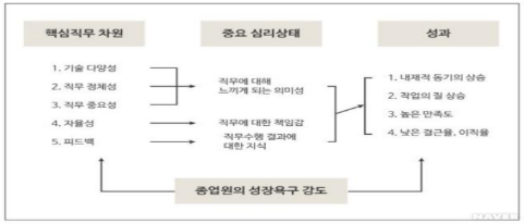- 조직 구성원을 동기부여 시키기 위해서는 하고 있는 일(직무)이 가진 특성들이 욕구를 충족시킬 수 있어야 함을 제시